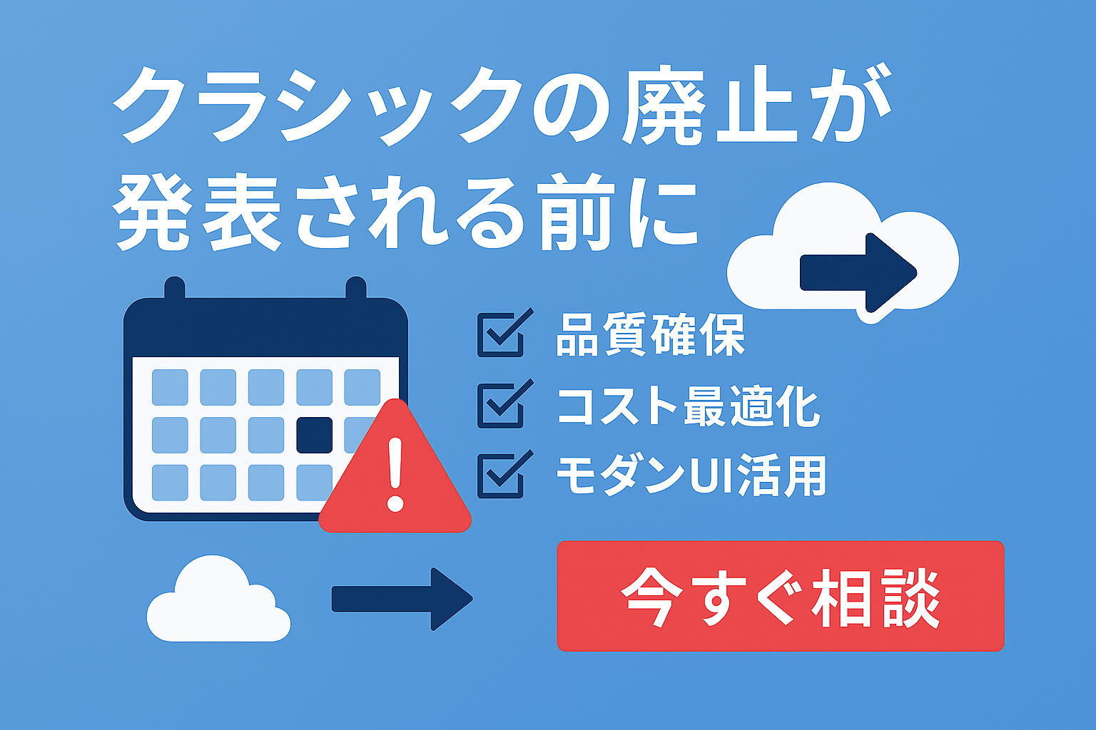 安全かつスムーズな移行を実現するためには、今このタイミングで着手することが最も合理的な選択です。早期移行により、余裕あるスケジュールで品質を確保し、コストを最適化しながら、モダンUIとMicrosoft 365の最新機能を最大限活用できます。